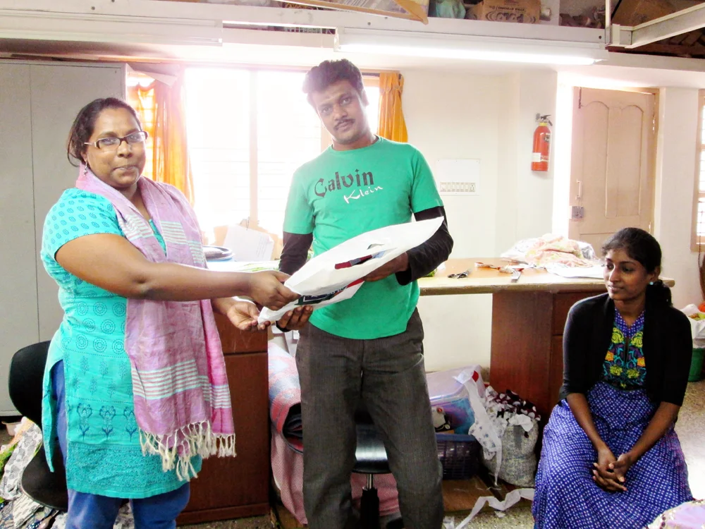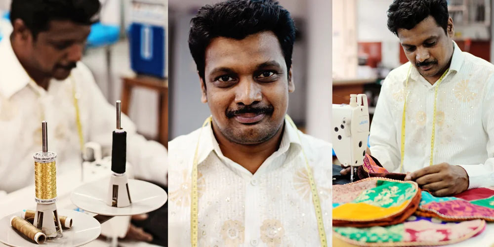 Originally recommended by a client, Ayub has been with us since 2010 and will be greatly missed. Often the lone male in a workplace full of chattering women, his calm and quiet manner and respectful attitude made him a perfect team member. Ayub worked primarily on producing sample items and tackling the most complicated stitching work; he has also been a patient teacher for all the girls, particularly Sumitra who is now confident enough to take over much of his work to an excellent standard.