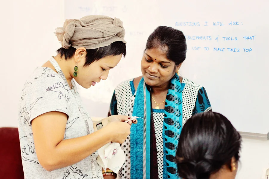 Theresa, from Australia, was in Bangalore for several months and contacted us, eager to come in and learn more about our unit. With a lot of experience in both hands-on tailoring and the business side of garment production, we were the first fair trade unit she had spent time in and it was very interesting for all of us to learn about the differences between the way we work and the conventional garment sector. Initially set to spend time with each group in the unit – training, pattern cutting, stitching and finishing – Theresa enjoyed the training so much that she chose to get stuck in with them fully for the time that she was here.